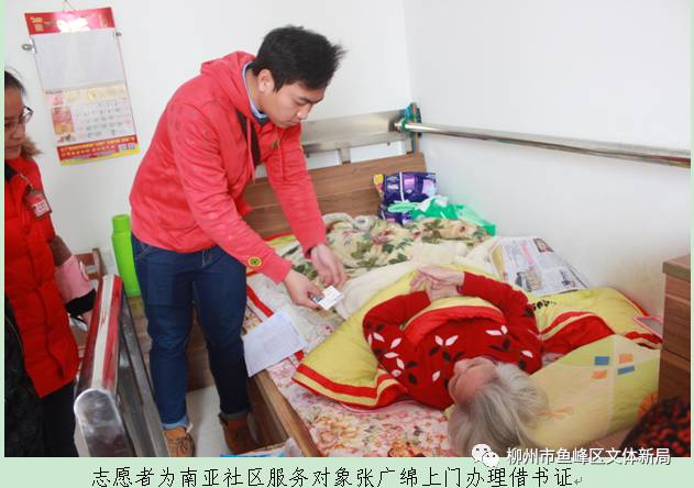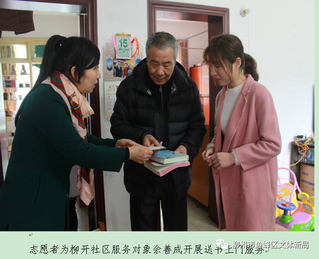2月15日至2月17日,鱼峰区图书馆携手柳州市图书馆,组织志愿者分别来到鱼峰社区、柳开社区、南亚社区开展“多带一本书”志愿者送书入户公益服务活动,为我区首批20户行动不便的、对阅读有需求爱好的社区居民,提供免费办理图书馆借书证、送书上门服务活动。
